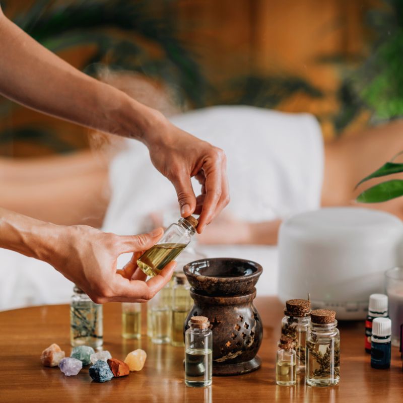 Uso terapéutico de aceites esenciales naturales para estimular los sentidos y equilibrar las emociones. Esta técnica complementa otros tratamientos como masajes o respiración guiada, creando un entorno sensorial que promueve el bienestar integral.
